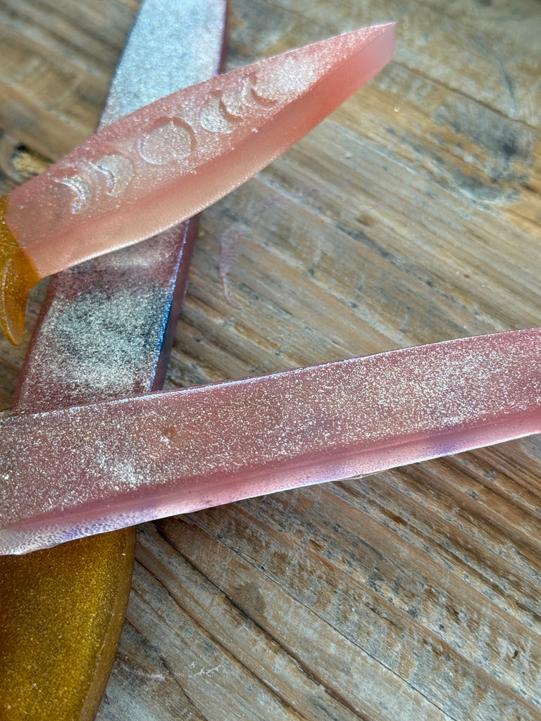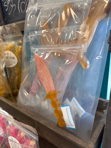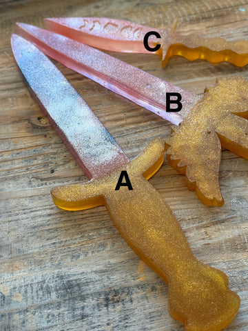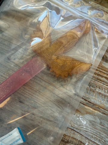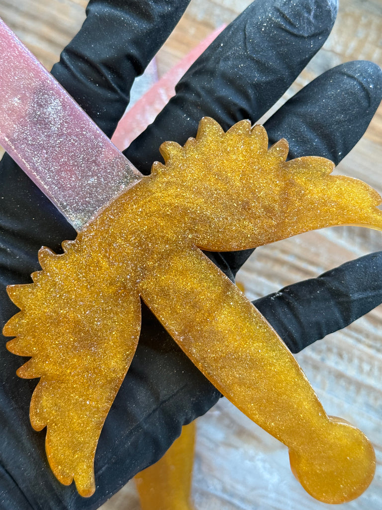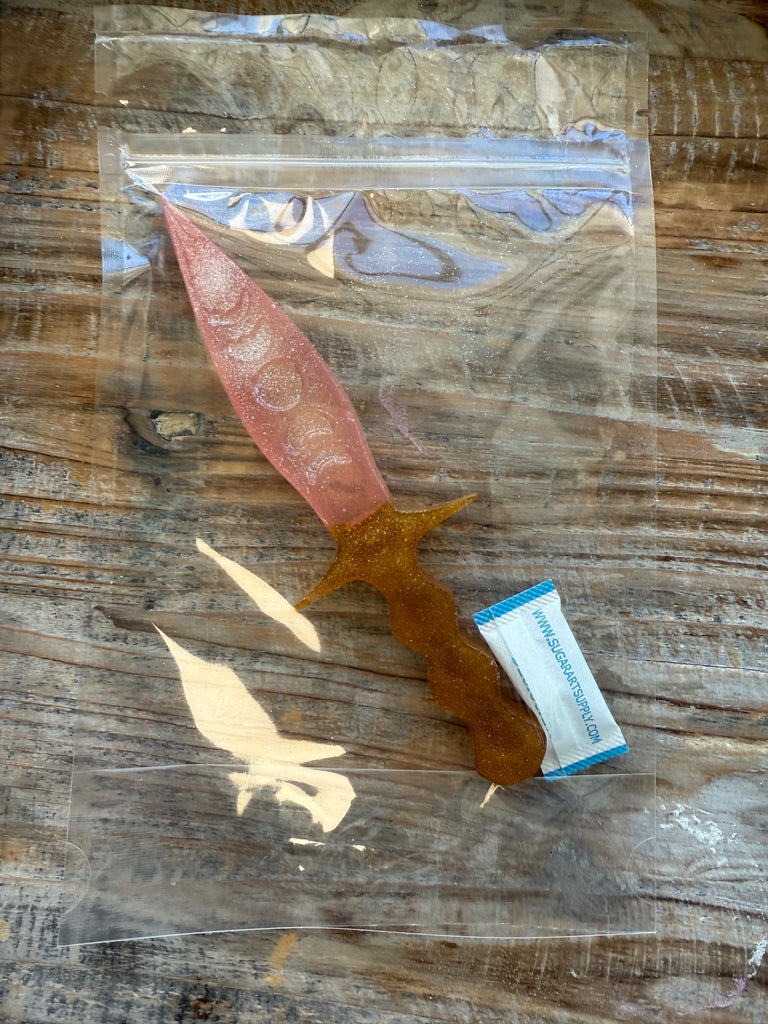100% Edible Sugar Hard Candy KPop Hunter Sword  Cake Topper by Pege Yates, Food Network Featured Sugar Artist in Saint Louis, Missouri.  This Sword Cake Topper is hand-crafted and made to place on top of your cake can also be eaten like a giant lollipop!