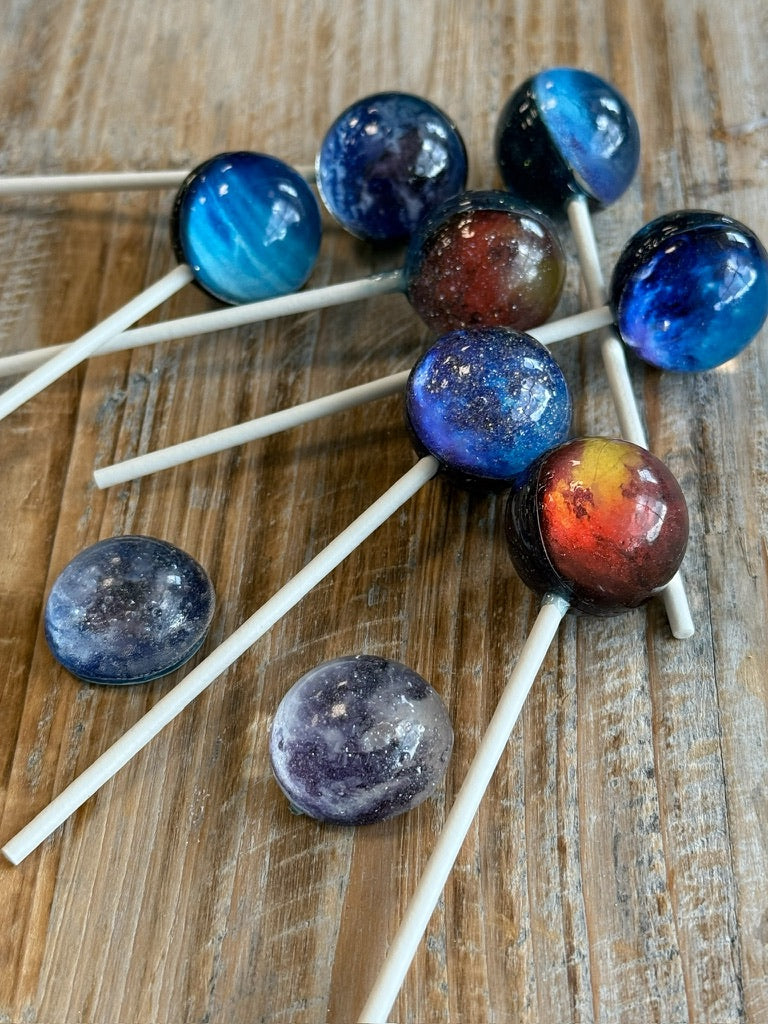 Blast off into edible art with our Cosmic Space Lollipops™ — handcrafted hard candy lollipops inspired by galaxies, nebulas, stars, and deep space. Each lollipop features swirling cosmic colors and shimmering details, making them perfect for space-themed parties, cake toppers, favors, and dessert displays.