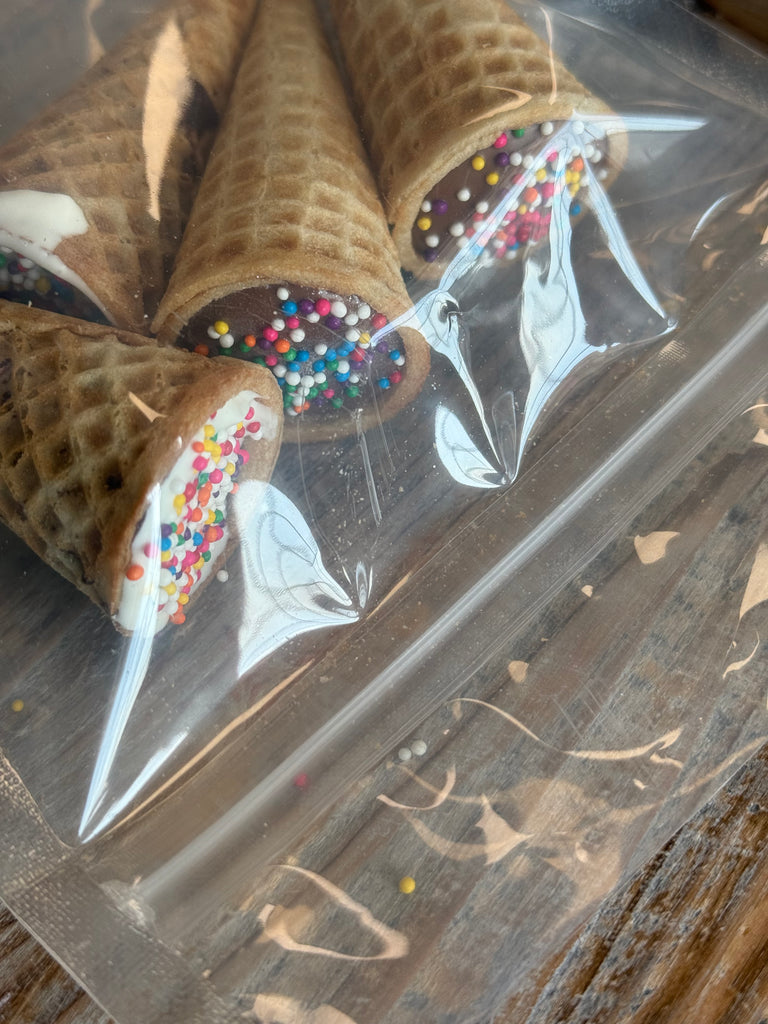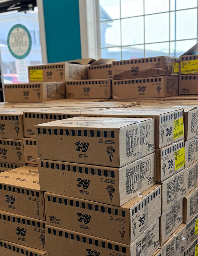 Set yourself apart from your competition by using these small sugar cones to hand out samples at your shop. Allow your customers to get the full experience when sampling with sugar cones that enhance the presentation and taste, as opposed to serving samples of your frozen desserts on a tasting spoon. Serve these sample cones with your bestselling ice cream outside of your shop to draw in customers to your business. Showcase all of your most popular ice cream flavors in this cone's classic, pointed, conical shape. Deliciously crunchy and irresistible, these Joy cones are sure to satisfy! Joy #450S sugar ice cream cones are packaged in a bulk format, stacked in 4 layers of 200 cones inside of a poly-lined case to ensure freshness.